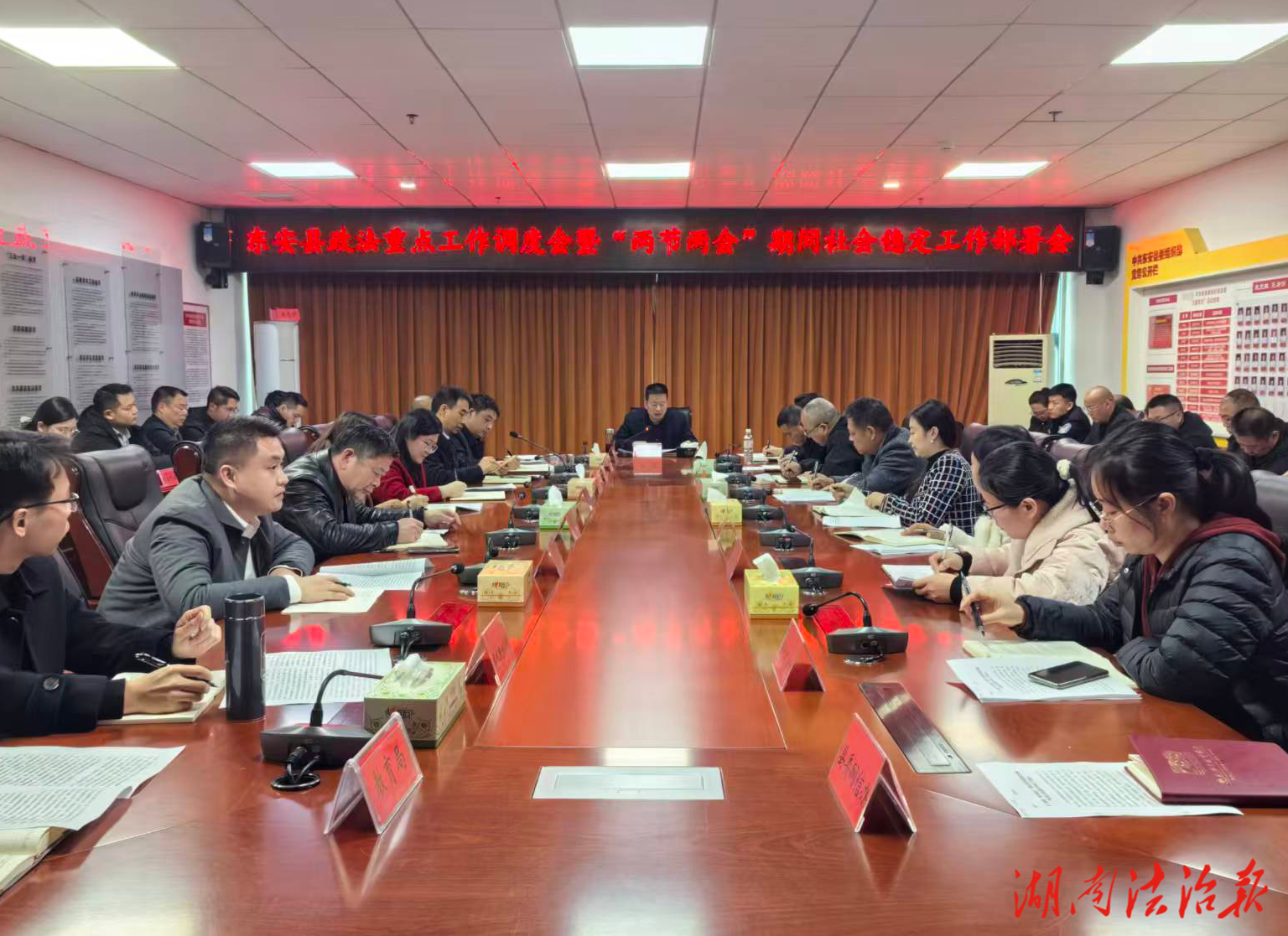 湖南法治報訊(通訊員 鄧忠寶)為全力保障歲末年初社會大局和諧穩定,12月18日,東安縣召開專題會議,研究部署政法重點工作,并對即將到來的元旦、春節及各級兩會(以下簡稱“兩節兩會”)期間社會穩定工作進行周密安排。縣委常委、政法委書記秦波出席會議并講話。縣直相關單位平安建設分管領導、縣委政法委班子成員、各鄉鎮場政法委員參加會議。